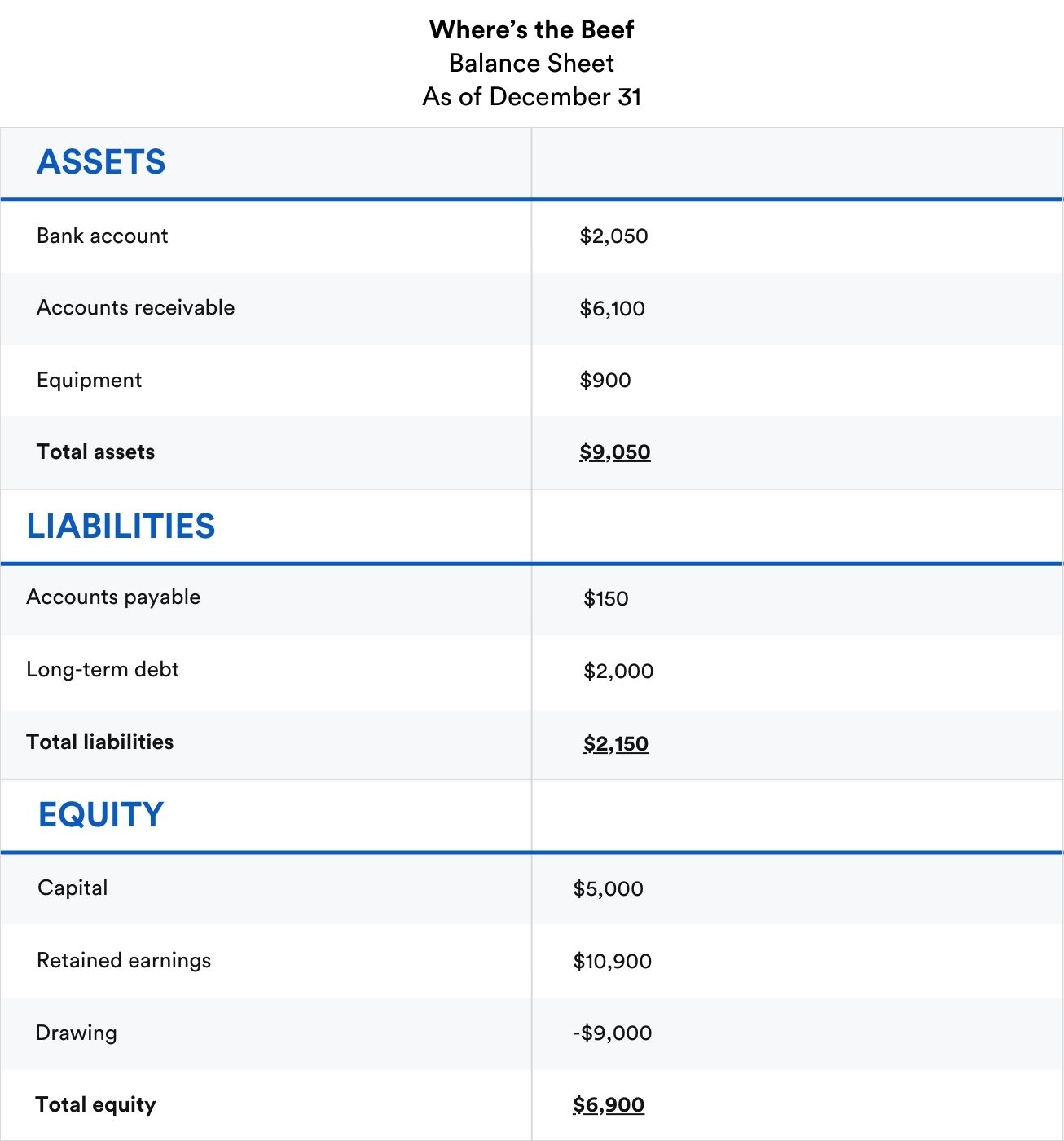 Let’s say you own a vegan catering business called “Where’s the Beef”. As of December 31, your company assets are: money in a checking account, an unpaid invoice for a wedding you just catered, and cookware, dishes and utensils worth $900. Here’s how you’d list your assets on your balance sheet: