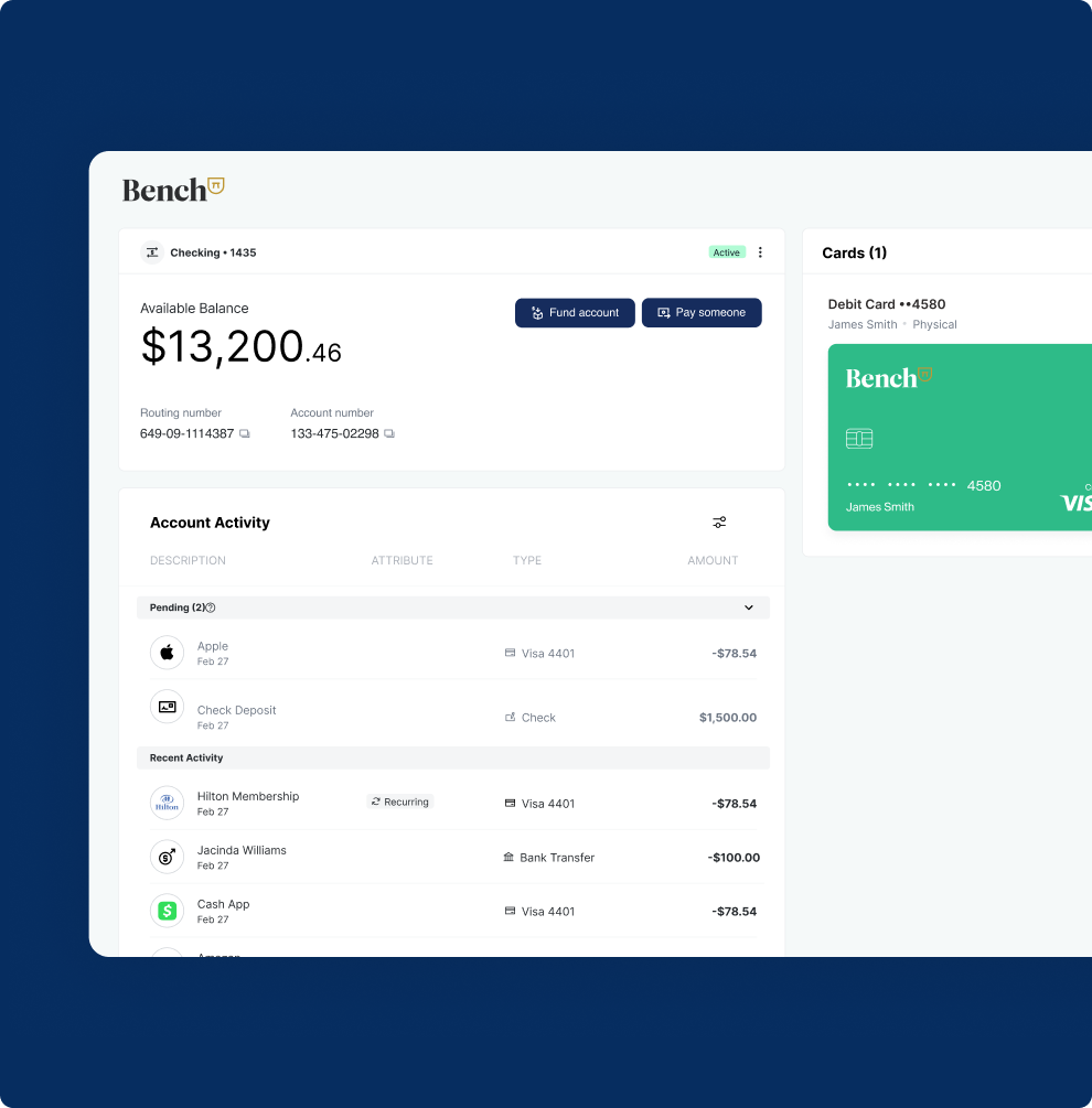 *Bench is a financial technology company and not a bank. Banking services are provided by i3 Bank, Members FDIC. Visa® debit cards are issued by i3 Bank, Members FDIC pursuant to a license from Visa U.S.A. Inc. and may be used everywhere Visa debit cards are accepted.