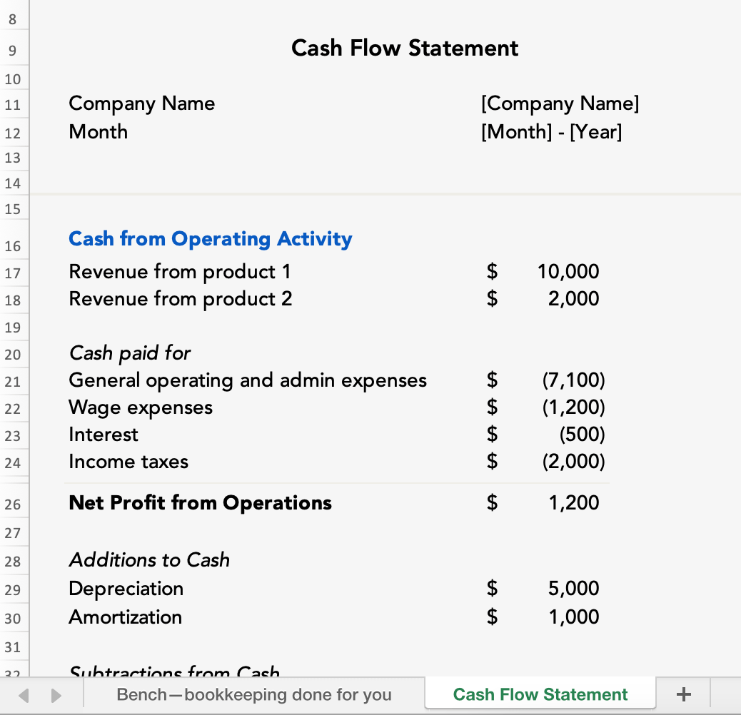 Bench Accounting's free cash flow statement template is designed to simplify the way you track and understand your income and expenses. Whether you’ve been growing your business for a while or are a new entrepreneur, our template can serve as a powerful tool that enables you to keep track of every dollar coming in and out of your businesses.