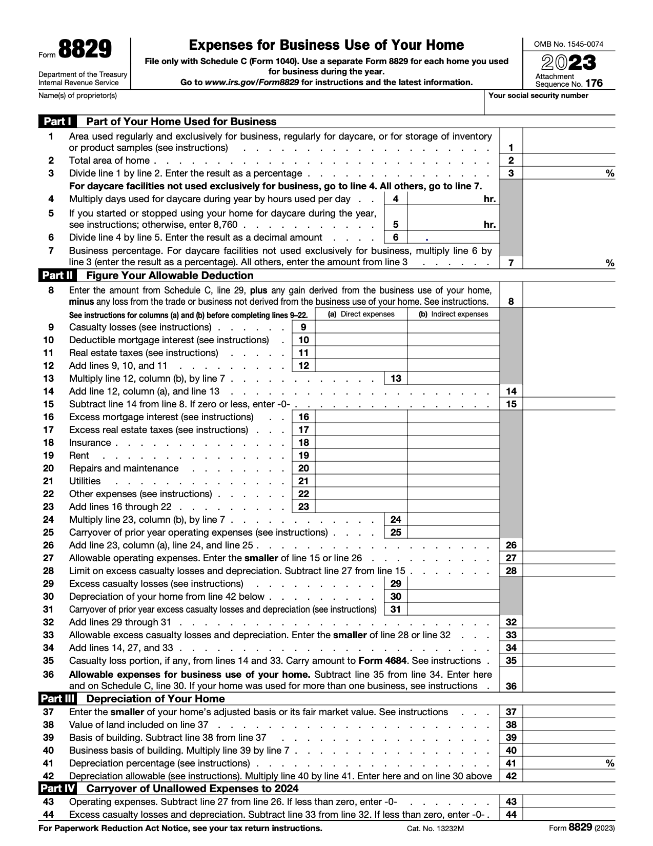 Lines 9-31 are for calculating all of the direct and indirect expenses associated with your home office, from mortgage interest and real estate taxes to utilities and rent. Many of these expenses can also be claimed on Schedule A, so make sure to consult the instructions to Form 8829 before completing this part. This is also where you’ll claim business expenses that may not fit under the traditional “home office” expense category (such as the cost of a business license).
