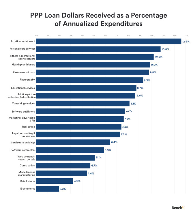 Payroll intensive businesses in hard hit industries received the largest PPP loans relative to their annual expenses. Arts and entertainment came in first with PPP loan amounts of around 12.5% of their annual expense levels. Restaurants and bars, two business types that struggled to stay open amidst the pandemic, saw PPP loan amounts of almost 10% their annual expenses.