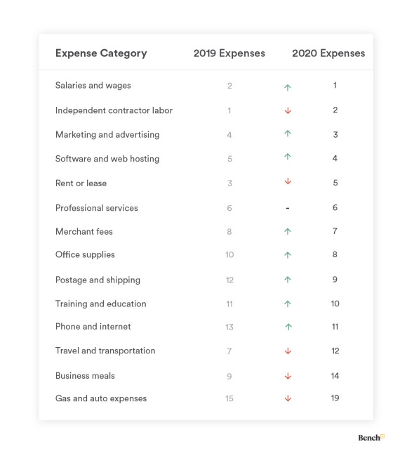 We wanted to understand whether the pandemic and PPP affected business spending in 2020. When looking at the top 10 expenses (and 4 additional expenses of interest) from the businesses we surveyed, the impact of the PPP is immediately evident.