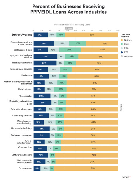 We reviewed a subset of around 10,000 small businesses using Bench in 2020 and still in operation in 2021. The goal: to find out how many received COVID relief, whether it was enough, and how much it impacted them.