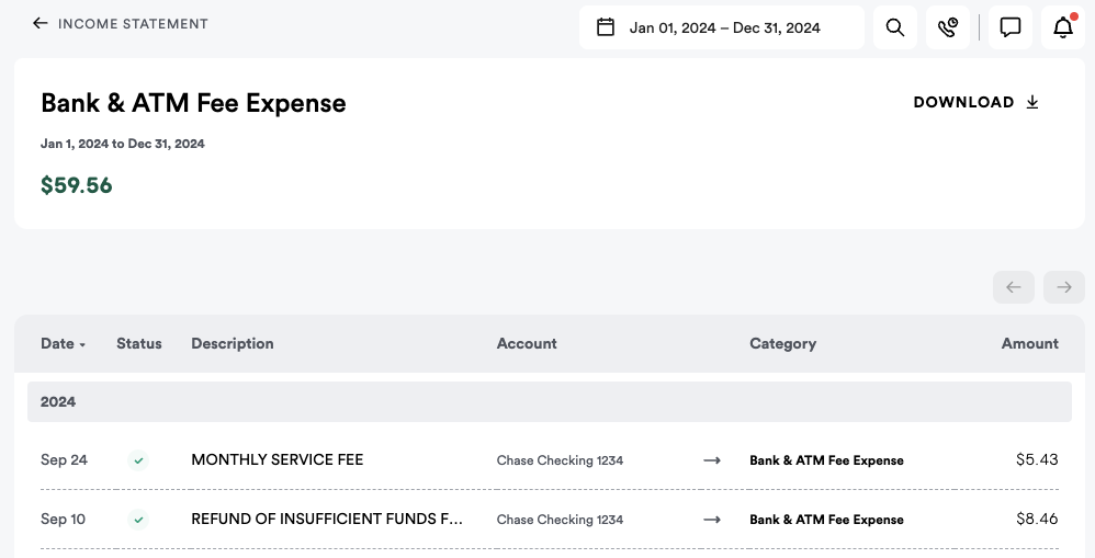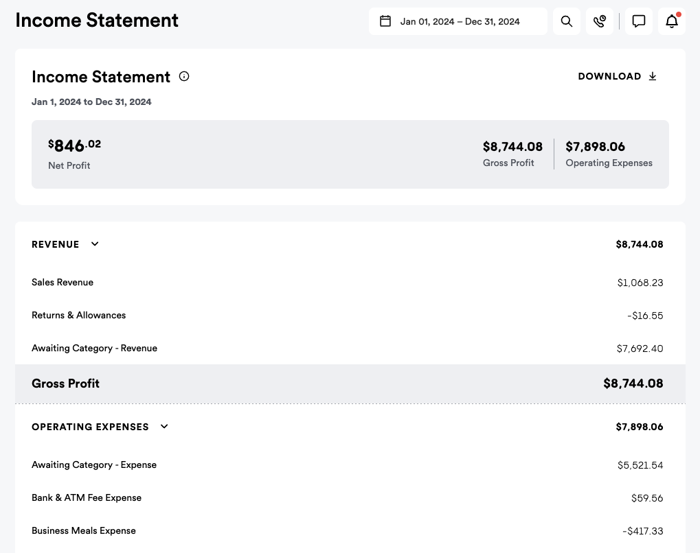 This report summarizes your financial transactions to show you how much you earned and how much you spent for a specific reporting period. You may also use the income statement to download transactions per category