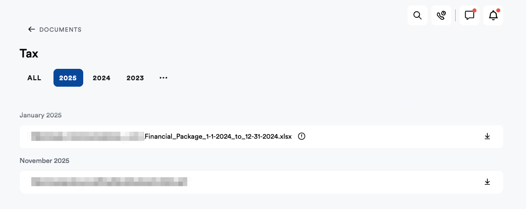 You can find your Year End Financial Packages and Tax Returns by navigating to: