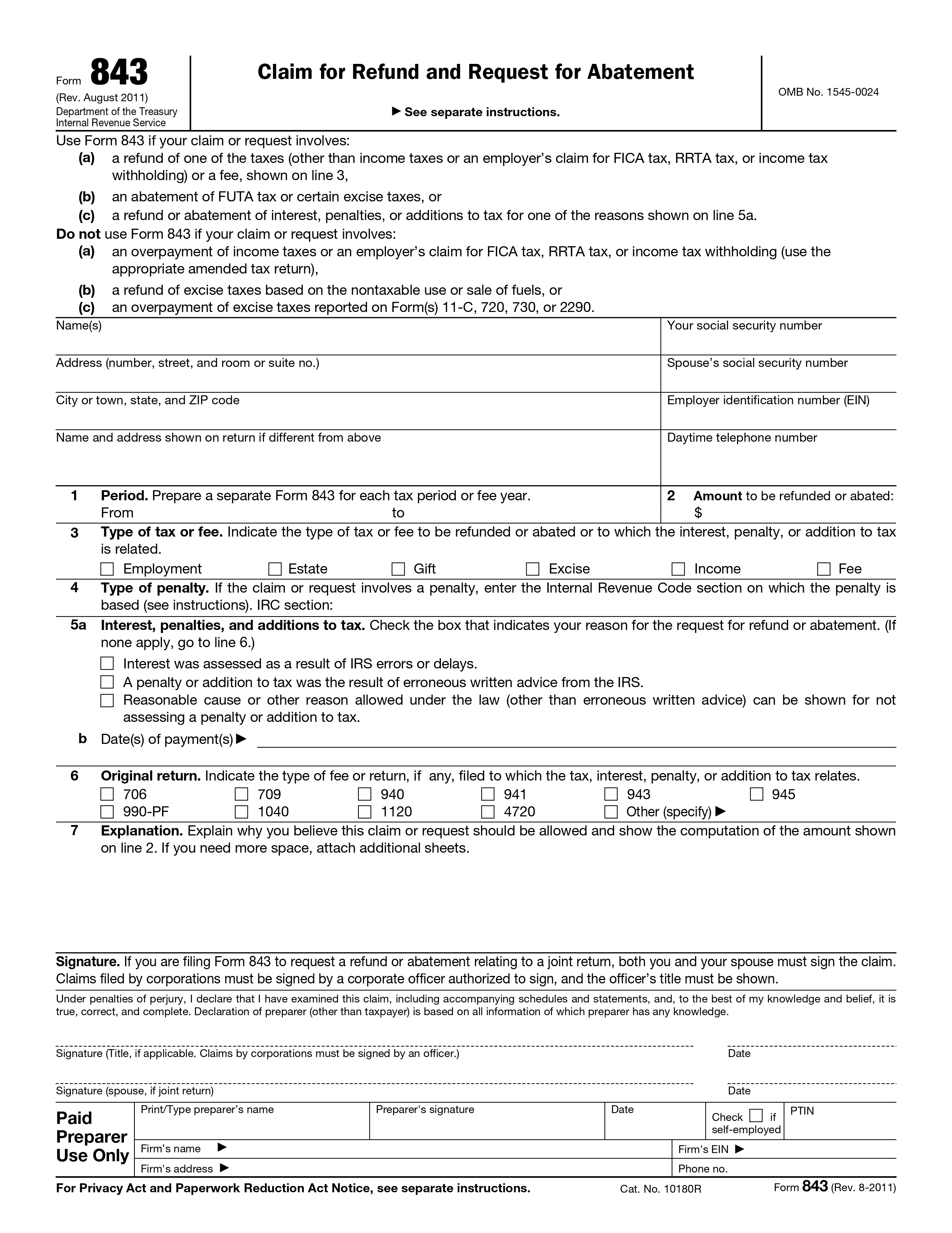 Form 843, Claim for Refund and Request for Abatement, allows you to request a refund or abatement of certain taxes, penalties, or interest.