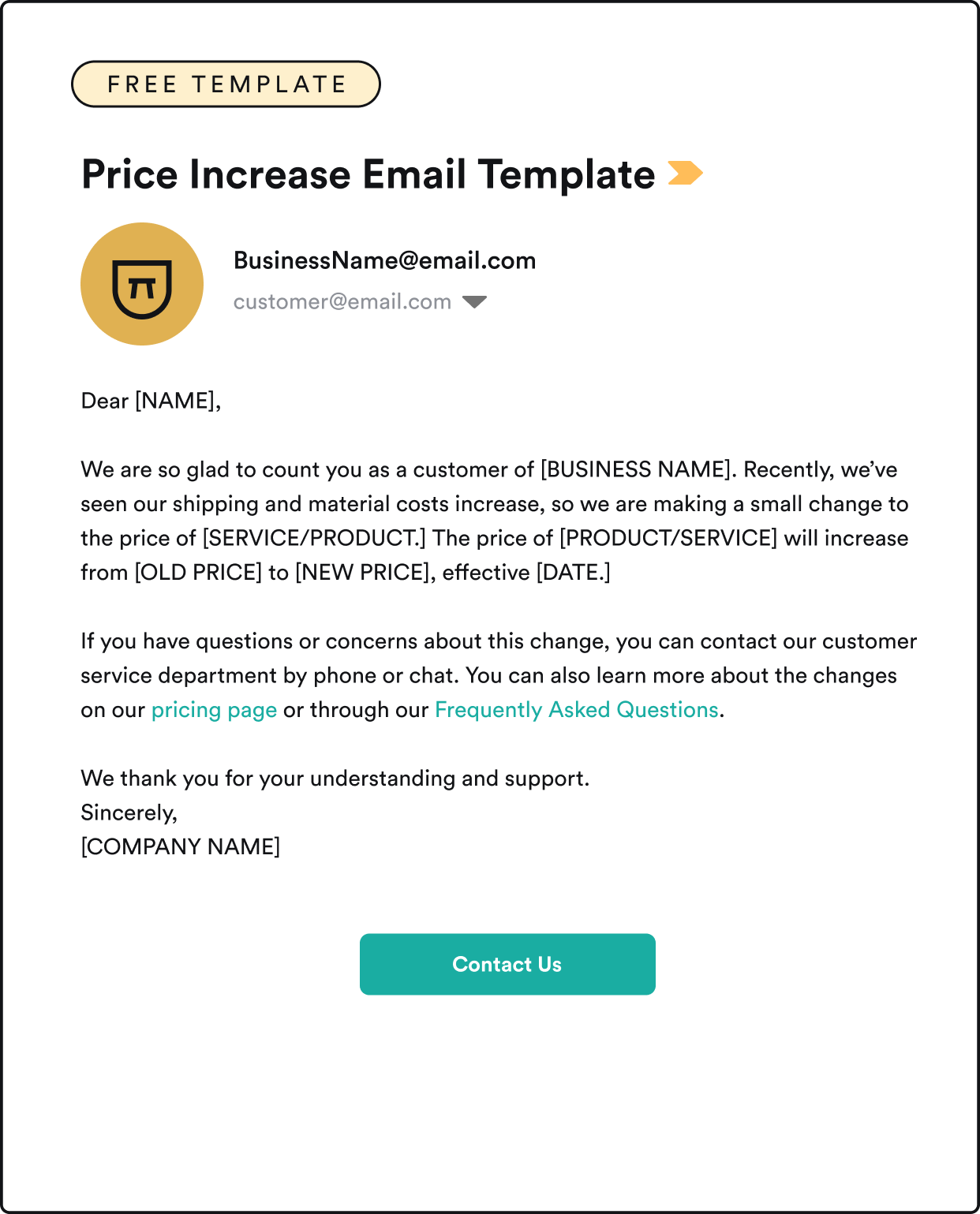 Wondering how to do that? This price increase letter template can help. It’s best to use this as more of a guide, as you want to make your communications as personal and unique to your business as possible. That will also help show customers that you care about them, not just your bottom line. Here’s an example:
